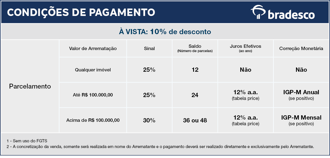 1. Eventuais alterações nas descrições dos imóveis, ou suas respectivas condições de venda, ocorridas até a data de realização do leilão, serão, a critério do Comitente Vendedor, noticiadas por meio deste site, cabendo ao interessado acompanhar e se cientificar das referidas alterações.2. As fotos são meramente ilustrativas, devendo o arrematante visitar os bens para tomar ciência das reais condições físicas.3. Quem tentar fraudar a arrematação poderá responder civilmente pelos danos (conforme os artigos 186 e 927 do Código Civil) e também criminalmente, conforme o artigo 358 do Código Penal. Este prevê pena de detenção de 2 meses a 1 ano, ou multa, além da punição correspondente à violência, caso haja uso de ameaça, fraude ou vantagem indevida para afastar concorrentes.
